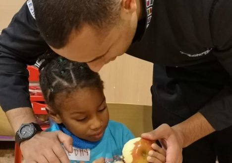 Atelier pâtisserie avec le chef Yazid Ichemrahen pour sa recette de compote pomme/poire sans sucre à Hôpital Robert Debré Paris. Merci Yazid pour ce moment de partage avec les enfants ! ??