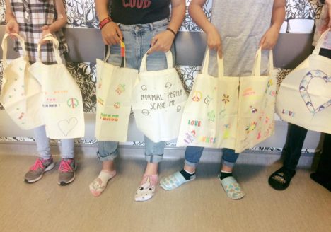 Le mercredi 13 juin, les adolescentes de l’hôpital de Poissy se sont vues proposer par notre bénévole Elizabeth, un atelier cusomisation de totes bags.