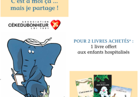 A partir de septembre 2016 et jusqu’en décembre, lorsqu’un client achète deux livres en librairie, l’école des loisirs s’engage à donner un livre (collection max) à l’association CéKeDuBonheur.