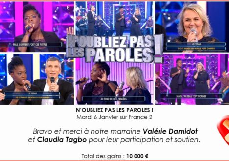 L’émission N’oubliez pas les paroles, présentée par Nagui, accueillait notre marraine Valérie Damidot, accompagnée de la comédienne Claudia Tagbo, qui soutient notre association depuis de nombreuses années. Les deux femmes ont entonné…